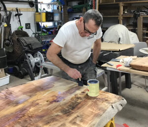 When the slab that you selected comes back to my shop is when the real fun begins… the finishing process! This is where we will talk about the type of finish that you are wanting…….stain color, oil finish, resin fills and color to fill cracks, checks, and knot holes!